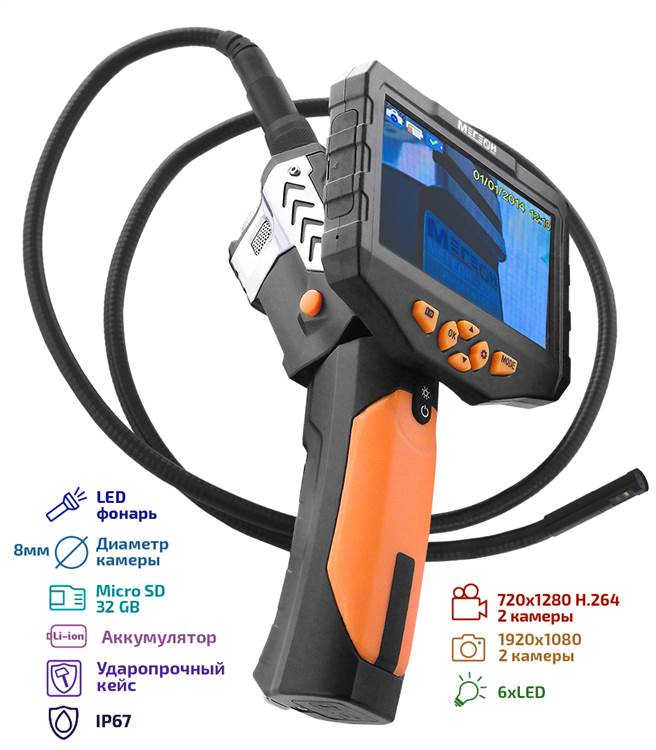 МЕГЕОН 33500-18D - новинка в модельном ряду цифровых видеоскопов, предназначенный для решения задач в быту и промышленности. Эндоскоп представляет собой устройство для исследования и осмотра скрытых от глаза полостей с возможностью сохранения видеоизображения со звуком на встроенный носитель SDHC 32Гб. Помимо этого предусмотрено получение цветных изображений с помощью фотографий. Зонд диаметром 6,9 мм и длиной 1 метров имеет полужёсткую конструкцию на конце которого поместились две перпендикулярно направленные камеры. Подсветки оснащены яркими светодиодами со ступенчатой регулировкой яркости, которые обеспечивают работу в условиях полного отсутствия освещения. Большой ЖК-дисплей с разрешением 854 х 480 и диагональю 4,3' отчётливо отобразит всё происходящее перед объективом. Дополнительно в корпусе предусмотрена подсветка с высокой интенсивности свечения, которая с лёгкостью заменит фонарик. Преимущества изделия по достоинству смогут оценить профессионалы и любители.